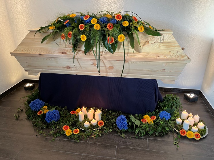 In unserem hellen, freundlichen Abschiedsraum haben Sie die Möglichkeit in aller Ruhe Abschied von Ihrem Verstorbenen zu nehmen. Sie können sich alleine oder gemeinsam mit Ihren Angehörigen am offenen Sarg verabschieden. Auf Wunsch dürfen Sie gerne durch verschiedene Rituale, wie z. B. Sargmalerei, Urnengestaltung, schreiben eines persönlichen Briefes oder abspielen von Musik den Abschied ganz persönlich und individuell für Ihren Verstorbenen gestalten.